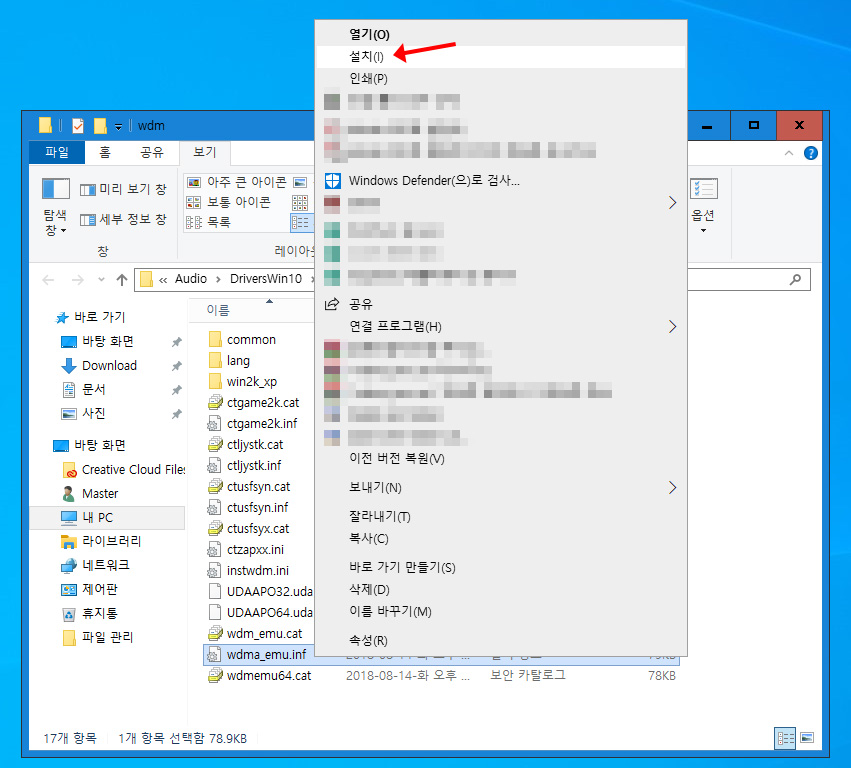 <순서.4> 새로운 사운드카드 드라이버를 설치합니다. wdma_emu.inf 파일을 마우스 우클릭을 하고 `설치'를 합니다.