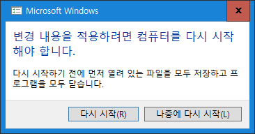 * '다시 시작'하기 전에 문서 작업이나 중요한 작업을 하고 있었다면, 반드시 모두 저장하고 프로그램 창을 닫고 재부팅 하세요!