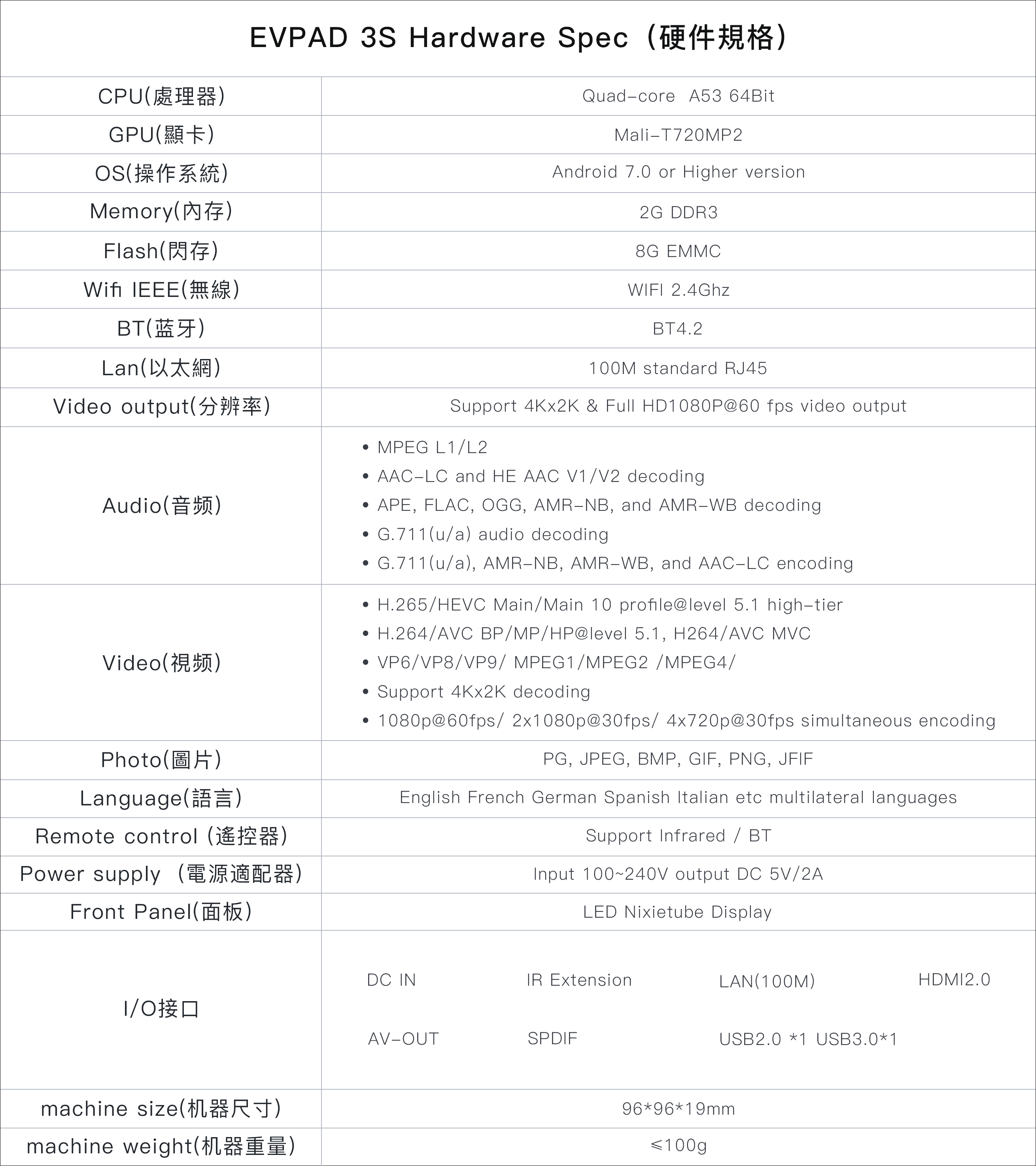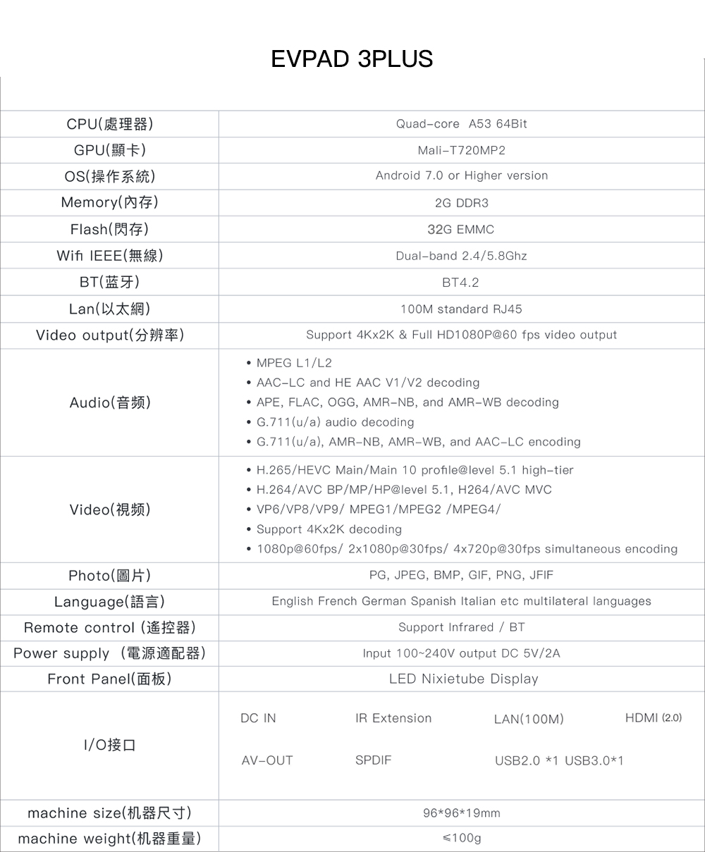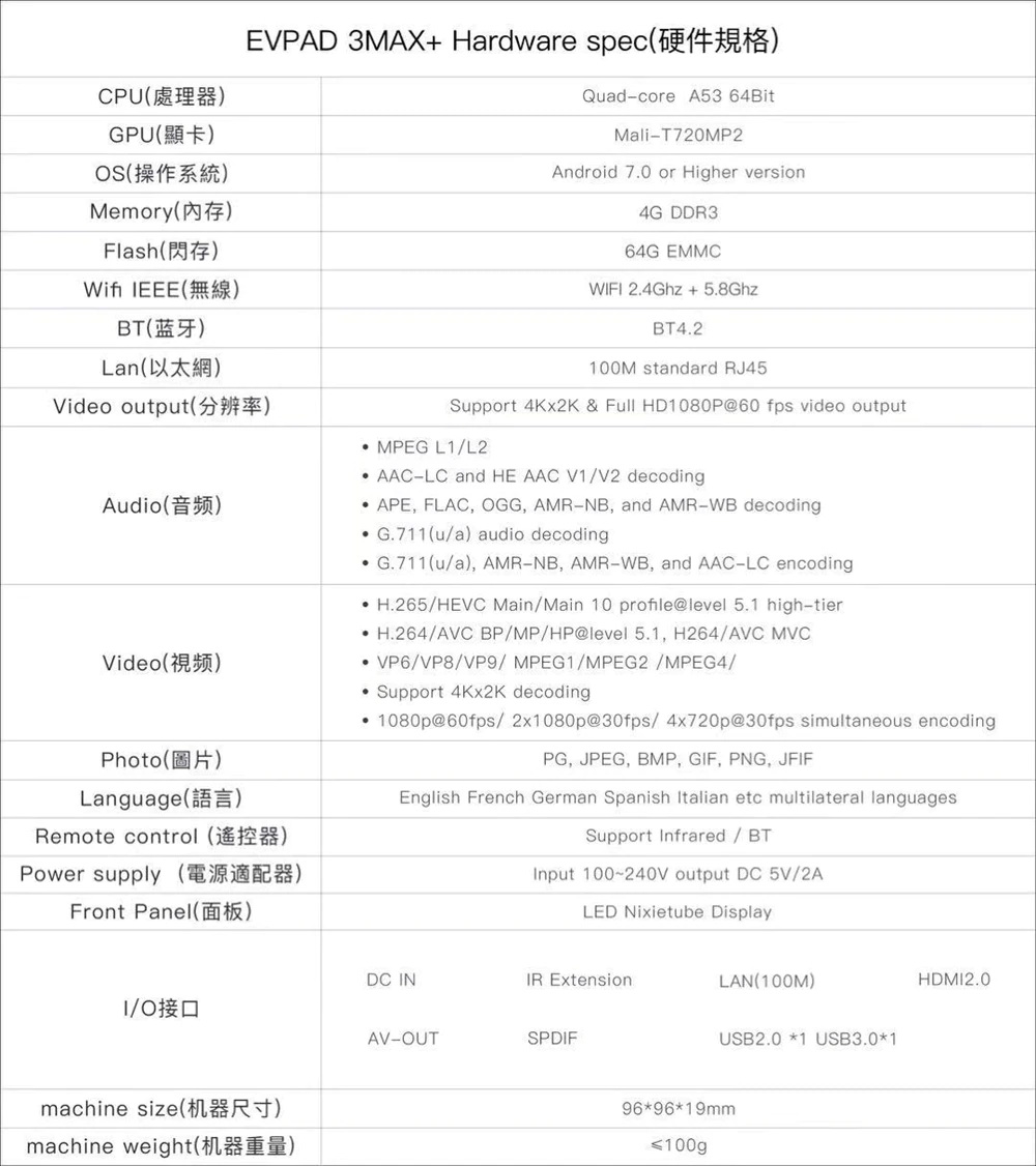 | EVPAD PRO+ | 1GB 16GB, A7 CPU Mali-400 MP4 GPU, 듀얼 WiFi 2.4Ghz/5.8Ghz, BT 4.0 |