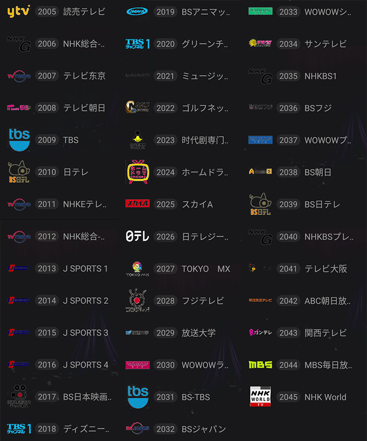 EVPAD 5P 셋톱박스에서 시청할 수 있는 일본방송 체널들입니다. 지상파, BS방송, WOWOW, 스카파 일부 채널을 시청할 수 있습니다.