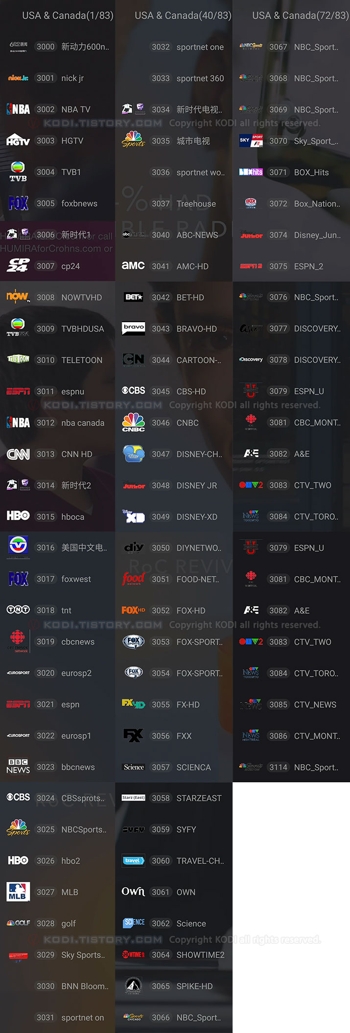 EVPAD 5P 셋톱박스에서 시청할 수 있는 미국 & 캐나다 방송 체널들입니다. 스포츠, ESPN, NBA, MLB, 뉴스, FOX CNN, 영화, 디즈니 애니 채널 등이 있고, 일부 방송은 화질이 상당히 좋습니다 (중국, 일본, 한국 등 다른 나라의 채널에 비해서....,)